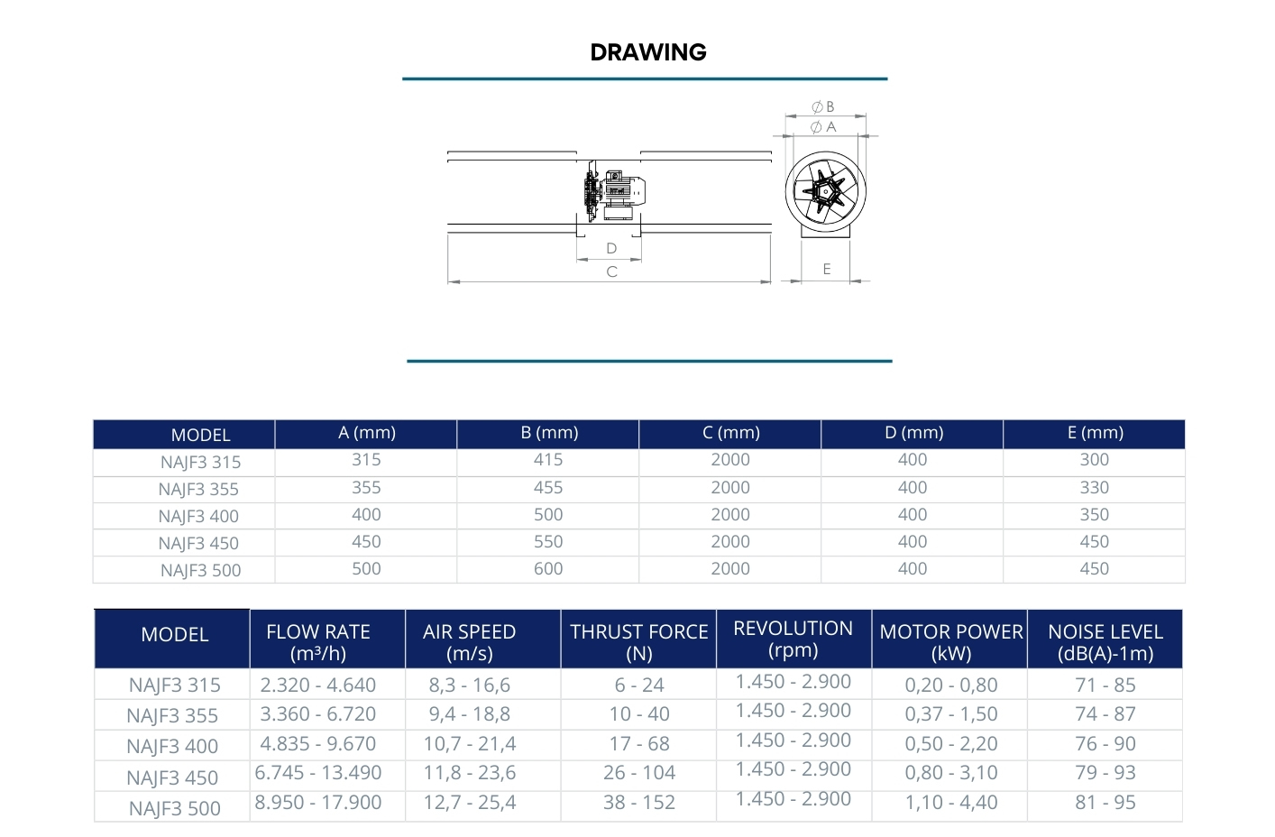 | MODÈLE | FLUX (m³/h) | VITESSE DE L’AIR (m/s) | POUSSÉE (N) | TRANSFERT (d/dk) | PUISSANCE DU MOTEUR (kW) | NIVEAU SONORE (dB(A)-1m) |