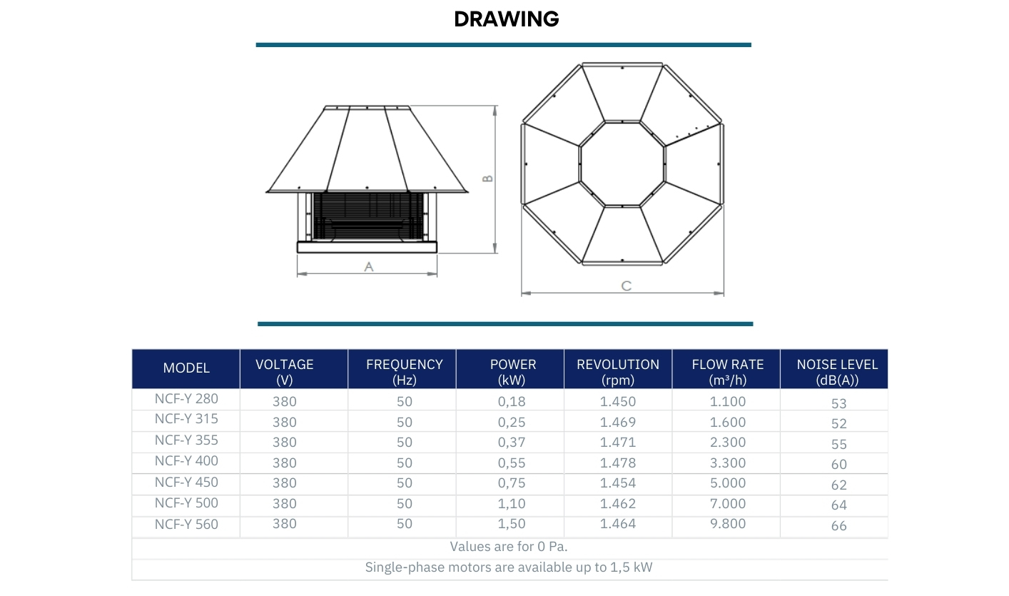 | NCF-Y 280 | 380 | 50 | 0,18 | 1.450 | 1.100 | 73 |