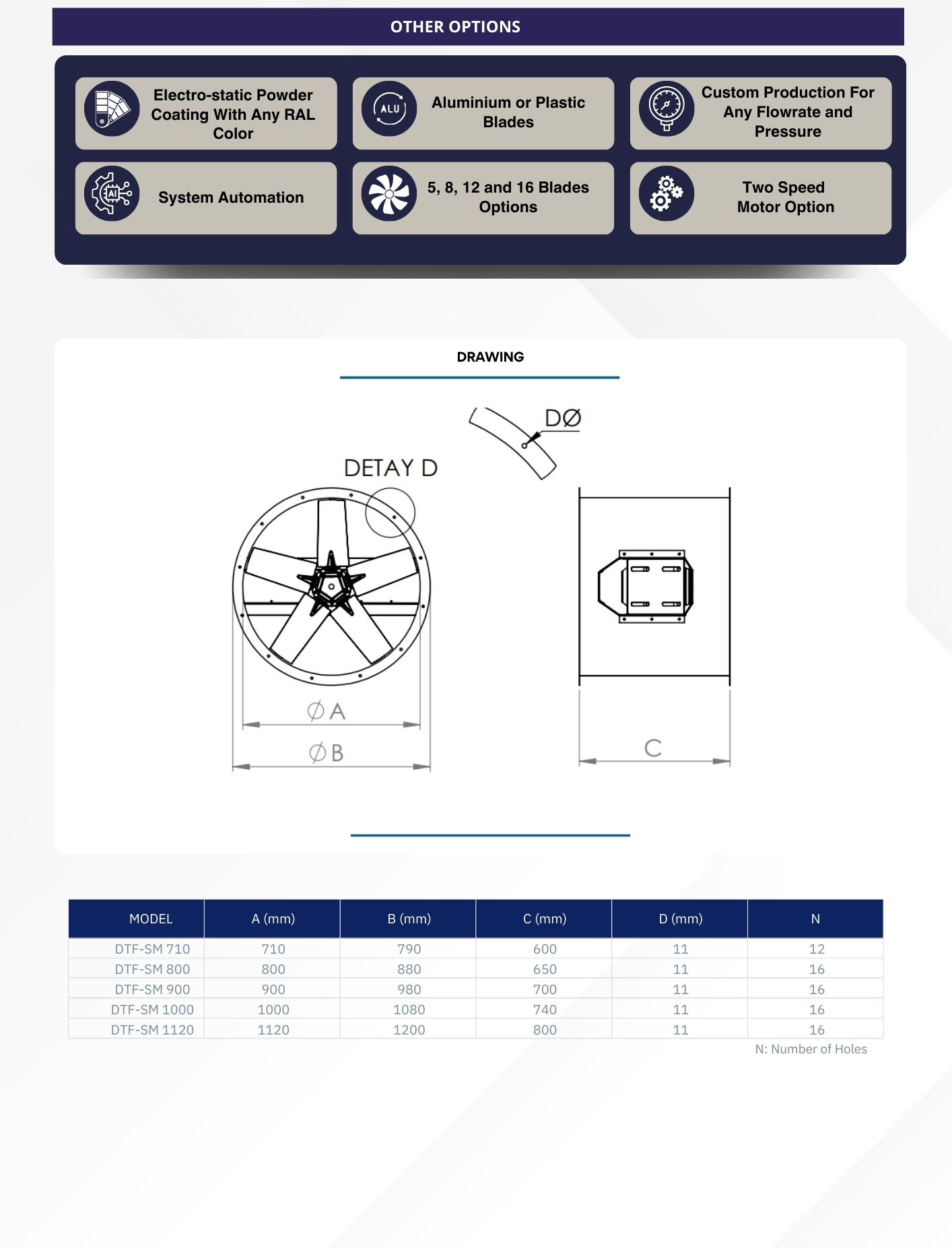| MODEL | VOLTAJ (V) | FREKANS (Hz) | GÜÇ (kW) | DEVİR (d/dk) | DEBİ (m³/h) | SES SEVİYESİ (dB(A)) |