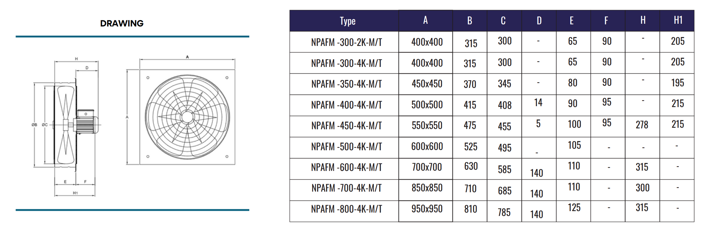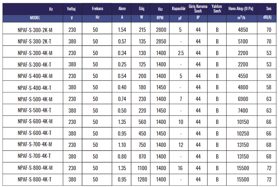 Hava akışı 2.250 m³/h ile 15.500 m³/h arasında değişmektedir. Gövde ve pervane, DKP sacdan üretilmiş olup elektrostatik toz boya ile korozyona karşı korunmuştur. Pervaneler dinamik olarak balanslanmıştır. Tek fazlı motorlar siyah, üç fazlı motorlar ise gri renkte boyanmıştır. Opsiyonel olarak, hava akışını ayarlamak amacıyla hız kontrol cihazı kullanılabilir.